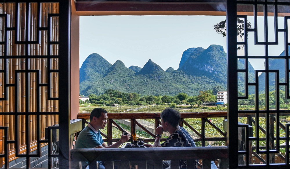 游客在廣西桂林市陽朔縣一家民宿喝茶聊天(2020年7月4日攝) 曹祎銘攝/本刊